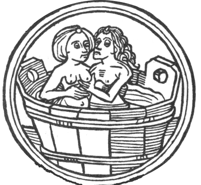 21. «Купающаяся пара». Немецкая резьба по дереву. XV век. Мужчина и женщина вместе в деревянной лохани, и его рука находится под одной из ее грудей.