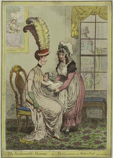 44. Джеймс Гилрей. «Модная мама». 1796. Младенец находится в неудобном положении между служанкой и матерью, его голова у материнской груди, а попу тянет вверх служанка. Эта зарисовка высмеивает модный культ материнского грудного вскармливания.
