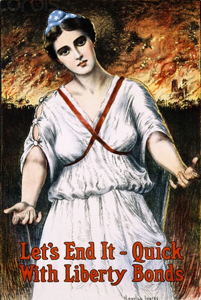 56. Морис Энгр. Американский плакат. 1917. «Давай покончим с этим – быстро – с помощью облигаций военного займа». Художник Морис Энгр увидел Свободу в более нежном и женственном облике. Он научился у своих древнегреческих и французских предшественников тому, как одновременно скрыть и подчеркнуть женские округлости.