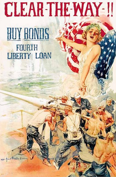 57. Говард Чендлер Кристи. Американский плакат. 1918 год. «Освободи дорогу! Покупай облигации четвертого военного займа». Прозрачная ткань, которая едва прикрывает груди Свободы, ее развевающиеся на ветру волосы, полуоткрытый рот на плакате Кристи создают впечатление, что позировала ему голливудская старлетка, записавшаяся в добровольцы.