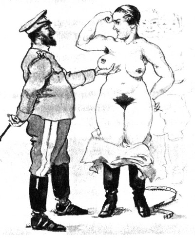 59. Запись в русскую женскую бригаду. 1917–1918. Русская карикатура. Будущего солдата женской бригады осматривает офицер-мужчина. Ее галифе спущены до колен, она демонстрирует мускулы, пока он, пользуясь удобным случаем, поднимает вверх одну из ее весьма внушительных грудей.
