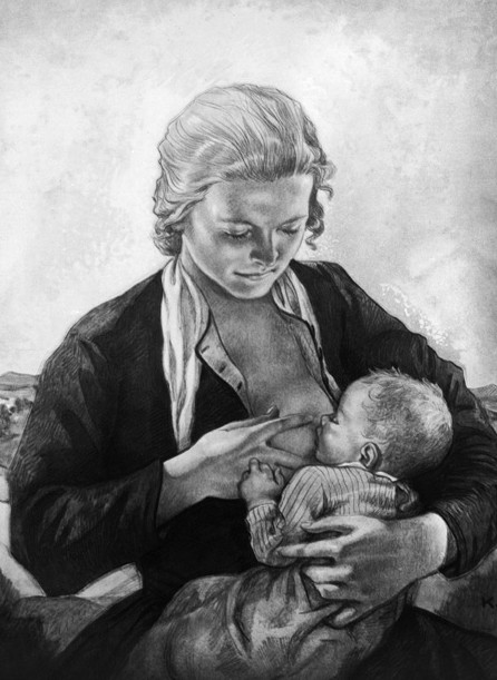 60. Немецкий плакат. 30-е годы. «Германия вырастает из сильных женщин и здоровых детей». Для пропаганды грудного вскармливания при нацистском режиме этот плакат с изображением матери и ребенка почти полностью повторяет изображение кормящей Мадонны.