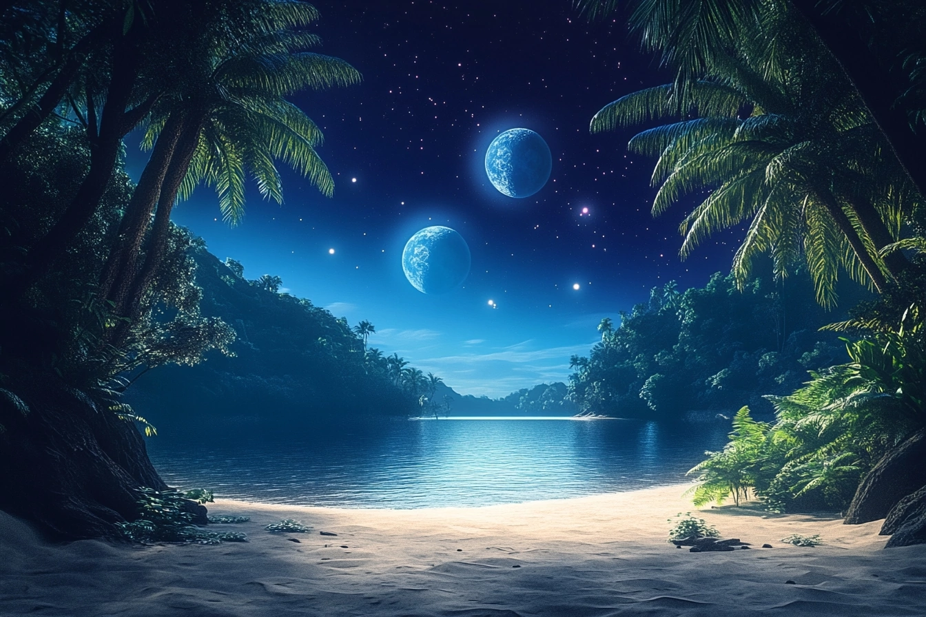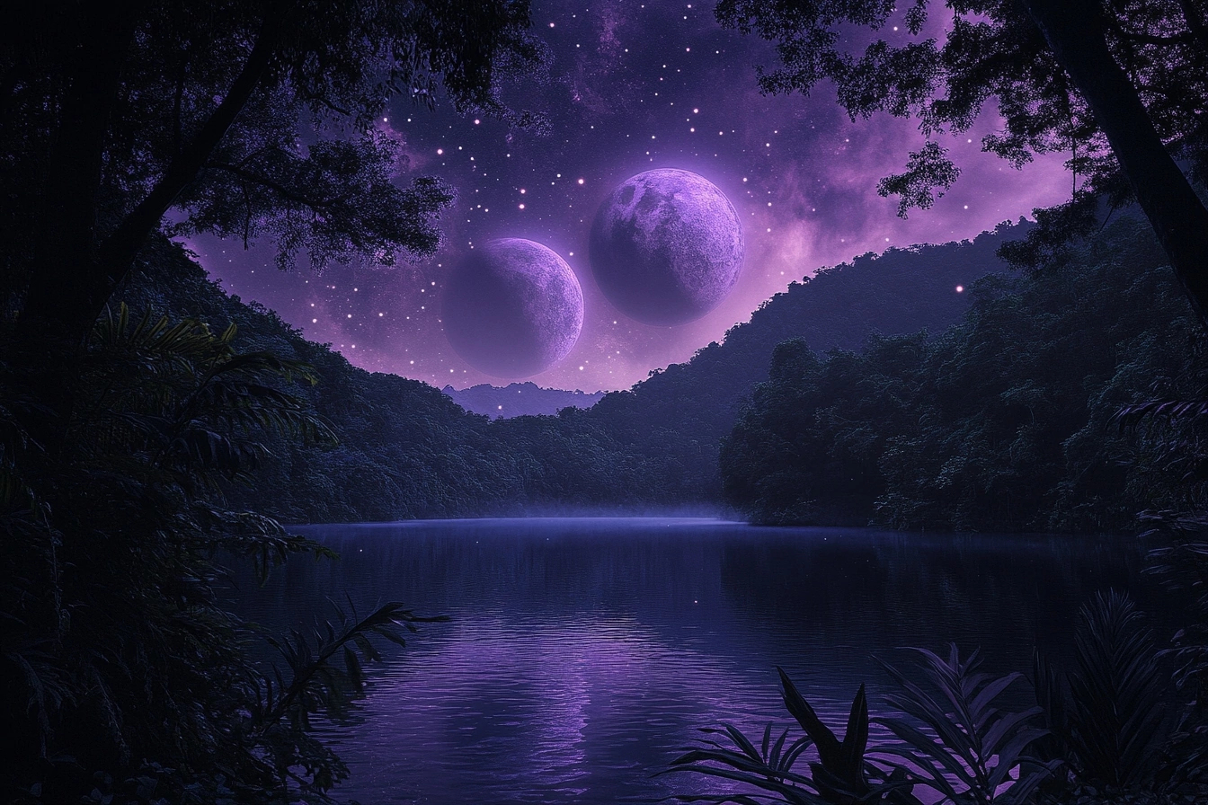 Ночь. Свет двух лун серебрился на дикой листве. Двумя красивыми дорожками подсвечивал озёрную гладь.
