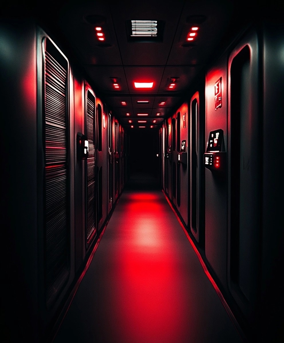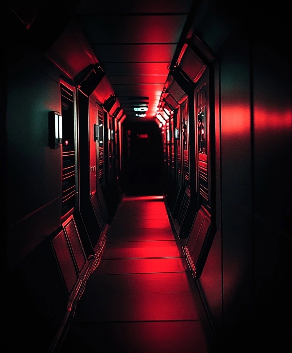 Я сама не поняла, как вместо осторожного шага, сорвалась на бег. Мои ступни гулко одарялись о металлический пол. Красный свет аварийных ламп пульсировал с бешеной частотой, выхватывая из тьмы обрывки коридора, ситуативно обнажая обстановку, лишь усиливая подступающий ужас.