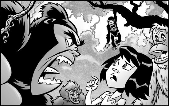 The gorilla slammed down hard in front of her, and the other creatures swung into view. The tiny yellow one leaped onto the gorilla’s shoulder and cleared her throat.