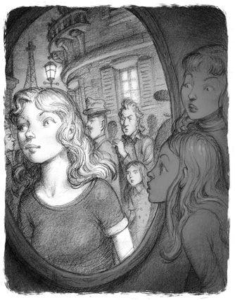 Mirror smiled. “That’s more like it.” His face dissolved and the mirror’s surface revealed a narrow avenue lined with elegant apartment buildings. Each building had a smoky bar, or a cozy restaurant, or a little boutique on its ground level. People were spilling out of all of them, drinking wine and gazing to the heavens. High above, fireworks filled the sky. Streams of blues, greens, reds, and whites shot across the horizon, then fizzled before the next round. In the distance, an enormous steel tower hovered above it all. It was illuminated by thousands of little lights, and at its top a beacon flashed a brilliant spotlight three hundred and sixty degrees.