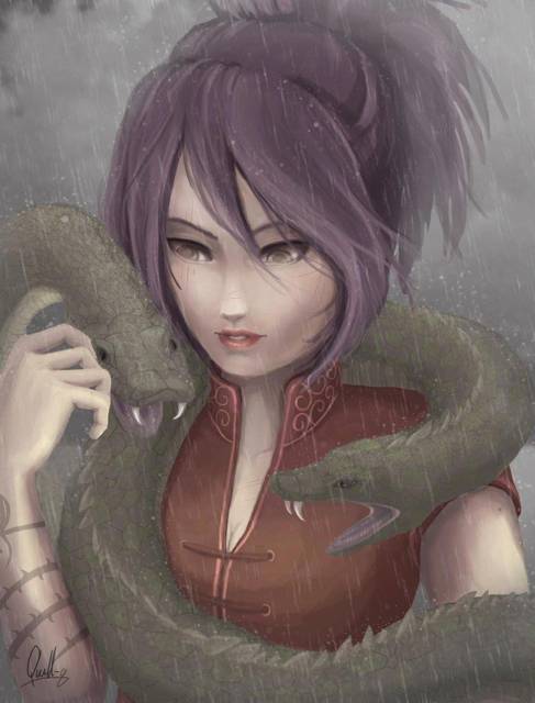 Незнакомка имела вьющиеся волосы тёмно-фиолетового цвета, прическу хвостик с ниспадающей на лицо челкой, желтоватые глаза, тонкие брови, ровный и тонкий нос, пухленькие губки, летнюю одежду и примечательную татуировку фуиндзюцу, которая напоминала змею что обвила руку. Она была на полголовы ниже Хатаке и наверняка являлась моложе его. Какаши потребовалось всего пару мгновений, чтобы разглядеть молодую девушку перед собой, однако долго думать о знакомой внешности ему не позволила сама собеседница.