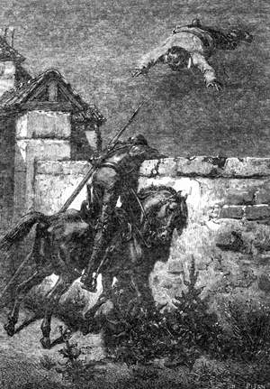 Истошные вопли злосчастного летуна донеслись до его господина, – тот остановился, прислушался и сначала подумал, что это какое-нибудь новое приключение, а затем, явственно различив голос своего оруженосца, повернул обратно, грузным галопом подскакал к постоялому двору, но, обнаружив, что ворота заперты, с целью как-нибудь туда проникнуть решился объехать его кругом; однако ж не успел он приблизиться к забору, коим был обнесен скотный двор, кстати сказать,не слишком высокому, как вдруг увидел, что над его оруженосцем измываются. На его глазах Санчо то взлетал, то опускался, и при этом с такой быстротою и легкостью, что если бы гнев, овладевший Дон Кихотом, в это самое мгновение утих, то он, уж верно, покатился бы со смеху. Попытался было он перескочить с седла на забор, но он чувствовал себя таким слабым и разбитым, что не мог даже спешиться, а потому ограничился тем, что, не слезая с коня, принялся осыпать подбрасывавших Санчо Пансу ругательствами и оскорблениями, которые мы не осмеливаемся здесь привести; однако летун Санчо по-прежнему стонал, перемежая стоны мольбами и угрозами, а сорванцы продолжали гоготать и заниматься своим делом, ибо все это на них не действовало, – отпустили же они в конце концов Санчо только тогда, когда устали его подбрасывать. Затем они подвели осла, усадили Санчо и накинули на него пыльник, а сердобольная Мариторнес, видя, как он измучен, рассудила за благо сбегать на колодец и принести ему кувшин холодной воды. Санчо взял кувшин и уже поднес ко рту, как вдруг услышал громкие крики своего господина: