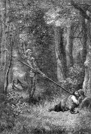 Санчо ничего на это не отвечал, потому что спал, и он бы так скоро и не пробудился, когда бы Дон Кихот кончиком копья не развеял его сон. Наконец он пробудился, сонным и безучастным взглядом обнял окрестные предметы и сказал:
