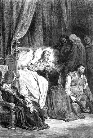Друзья послали за лекарем; тот пощупал пульс, остался им недоволен и посоветовал Дон Кихоту на всякий случай подумать о душевном здравии, ибо телесному его здравию грозит, мол, опасность. Дон Кихот выслушал его спокойно, но не так отнеслись к этому ключница, племянница и оруженосец – они горькими слезами заплакали, точно Дон Кихот был уже мертв. Лекарь высказался в том смысле, что Дон Кихота губят тоска и уныние. Дон Кихот попросил оставить его одного, ибо его, дескать, клонит ко сну. Желание это было исполнено, и он проспал более шести часов подряд, как говорится, без просыпу, так что ключница и племянница уже забеспокоились, не умер ли он во сне. По прошествии указанного времени он, однако ж, пробудился и громко воскликнул: