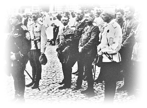 Вожди Добровольческой армии в Киеве: генерал Май-Маевский (первый слева), генерал Бредов (второй слева). 1919 год