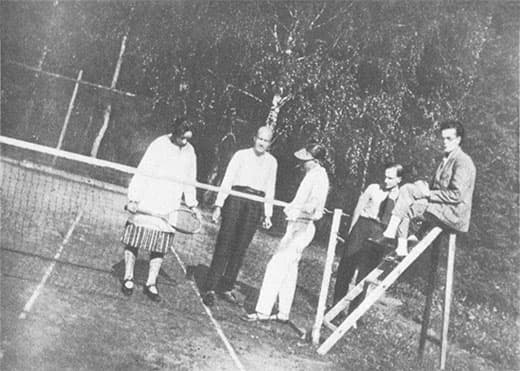 М. А. Булгаков с друзьями на даче у Понсовых в Крюкове под Москвой. Лето 1926 г. Слева направо: Л. Е. Белозерская-Булгакова; Н. Н. Лямин, М. А. Булгаков, И. И. Никитинский, С. С. Топлеников