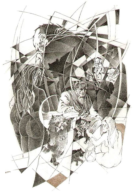 Кроме этих, был еще в комнате сидящий на высоком табурете перед шахматным столиком громаднейший черный котище, держащий в правой лапе шахматного коня.