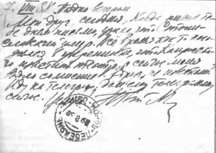 Почтовая открытка М. А. Булгакова Елене Сергеевне от 7 августа 1938 года