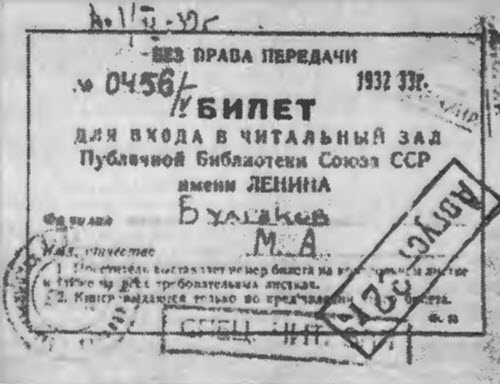 Билет М. А. Булгакова на вход в читальный зал Библиотеки. им. В. И. Ленина