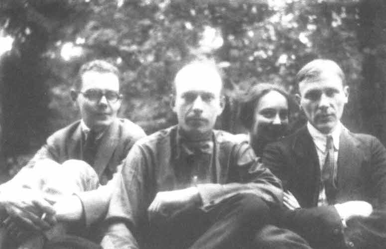 Справа налево: М. А. Булгаков, Л. Е. Белозерская, И. Н. Лямин, С. С. Топленинов. Крюково, 1926