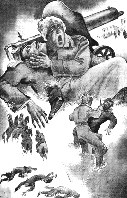 Глава 11Повинуясь телефонному голосу, унтер-офицер Турбин Николай вывел двадцать восемь человек юнкеров и через весь Город провел их согласно маршруту. Маршрут привел Турбина с юнкерами на перекресток, совершенно мертвенный. Никакой жизни на нем не было, но грохоту было много. Кругом – в небе, по крышам, по стенам – гремели пулеметы.
