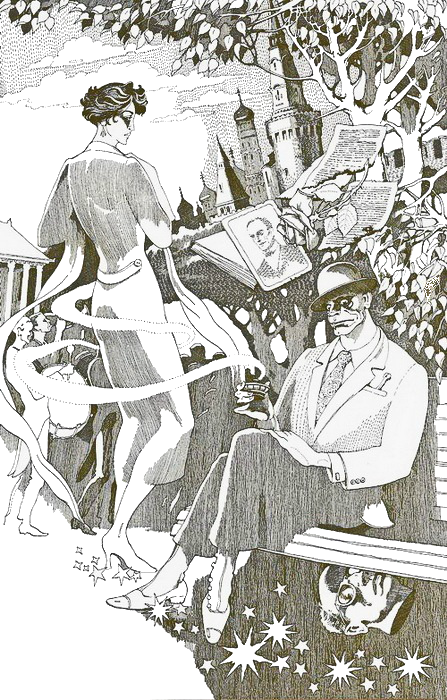 Маргарита рванула штору в сторону и села на подоконник боком, охватив колено руками. Лунный свет лизнул ее с правого бока. Маргарита подняла голову к луне и сделала задумчивое и поэтическое лицо. Шаги стукнули еще раза два и затем внезапно стихли. Еще полюбовавшись на луну, вздохнув для приличия, Маргарита повернула голову в сад и действительно увидела Николая Ивановича, проживающего в нижнем этаже этого самого особняка. Луна ярко заливала Николая Ивановича. Он сидел на скамейке, и по всему было видно, что он опустился на нее внезапно. Пенсне на его лице как-то перекосилось, а свой портфель он сжимал в руках.