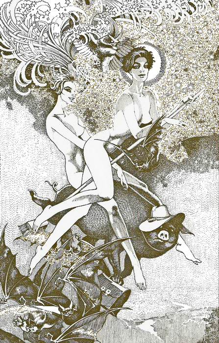 Тяжкий шум вспарываемого воздуха послышался сзади и стал настигать Маргариту. Постепенно к этому шуму чего-то летящего, как снаряд, присоединился слышный на много верст женский хохот. Маргарита оглянулась и увидела, что ее догоняет какой-то сложный темный предмет. Настигая Маргариту, он все более обозначался, стало видно, что кто-то летит верхом. А наконец он и совсем обозначился. Замедляя ход, Маргариту догнала Наташа.