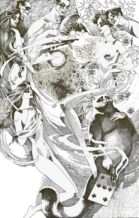 Коровьев вынул из ящика стола семерку пик, предложил ее Маргарите, попросив наметить ногтем одно из очков. Маргарита наметила угловое верхнее правое. Гелла спрятала карту под подушку, крикнув: