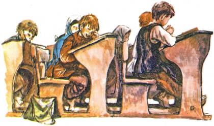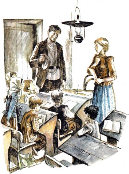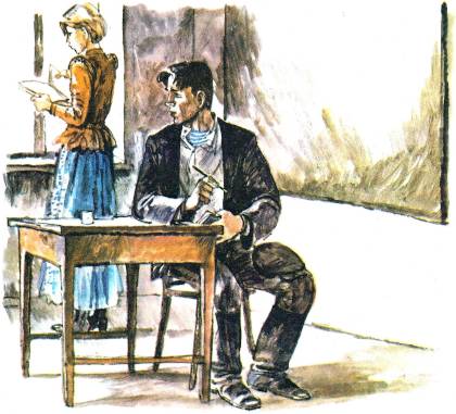 Он сел на предложенный ему стул около небольшого столика, а девушка, отойдя к окну, стала раздельно диктовать ученикам: