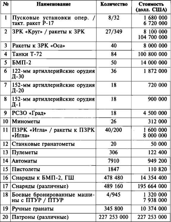 Достаточно вспомнить получение четырех Су-25, нашумевший скандал с поставкой танков Т-72, а также информацию о возможной передаче Еревану современных истребителей и ЗРК С-300. Как заявлял в Думе покойный генерал Лев Рохлин, с 1993 по 1996 год Армении передано большое количество различной техники и вооружения. Более детально поставки можно представить в таблице [77]77