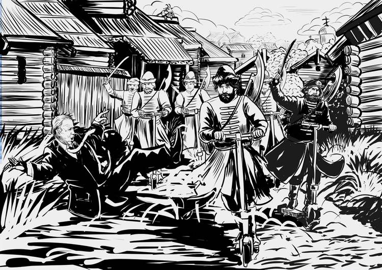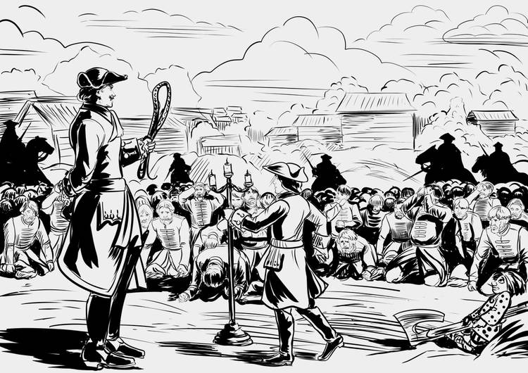 Опять же – невпопад. Строевому шагу люди были не обучены. Поэтому их командиры, активно дирижируя саблями, а то и бердышами пытались удержать линию построения. Бердышами даже в чем-то было удобнее. Они же довольно длинные. И значит их было легче использовать как направляющую, выравнивающую за раз сразу человека три-четыре.