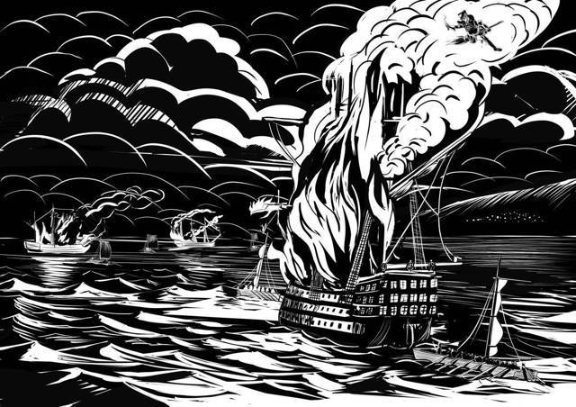 Такое же свето-представление наблюдалось и на других кораблях, стоящих ближе всего к островам. То тут, то там вспыхивали огромные факелы.