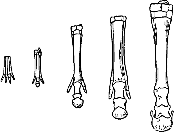 Непрерывная цепь промежуточных животных, сменявших друг друга на протяжении всего третичного периода, связывает их с современной лошадью. Пралошадь жила в начале третичного времени; позднее она превратилась в более крупную форму, у которой из трех пальцев на задних ногах средний сделался толстым и покрылся копытом, а два боковых стали меньше и едва доставали до земли. Еще позднее этого зверя сменило животное, у которого от боковых пальцев сохранились только жалкие остатки и которое при беге опиралось лишь на один средний палец (рис. 51). От него до нашей лошади остается только один шаг: у лошади от маленьких боковых пальцев сохраняются тоненькие косточки, которые называются грифельными. Они не имеют значения в жизни лошади.