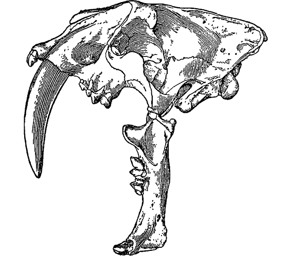 Подобного рода устройство зубов находим мы и у других хищников. Интересны, например, зубы вымершего «саблезубого тигра», изображенные на рис. 52. Здесь вы видите, как велики были у него клыки. Они висели изо рта, как сабли; чтобы схватить ими добычу, тигру приходилось раскрывать пасть так широко, как не может ее раскрыть ни одно из теперешних животных. Это и показано на рисунке. По устройству зубов или челюстей можно узнать эту породу хищников.