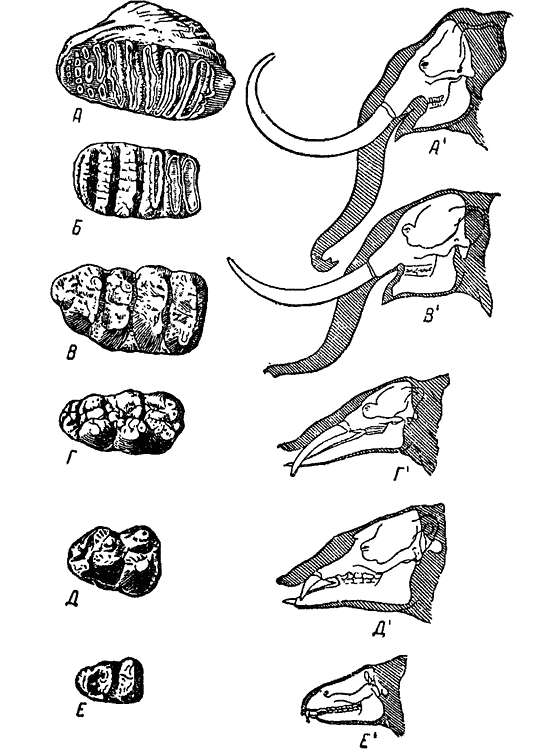 Рис. 53. Эволюция (снизу вверх) строения головы и зубов у предков слона