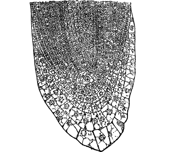 Рис. 8. Тонкий разрез через верхушку корня растения (под микроскопом). Видны многочисленные клетки с округленными ядрами