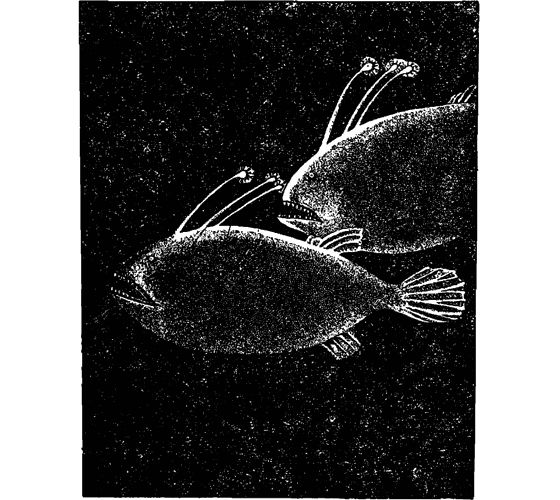 Постоянное спокойствие прохладной воды изредка нарушается появлением странных, невиданных форм глубоководных существ. Некоторые из глубоководных рыб почти лишены глаз – от этих органов у них сохранились лишь маленькие зачатки, как у крота; у некоторых глаза вовсе исчезли, зато на переднем конце морды находятся огромные светящиеся пятна. У других имеются выросты со световыми органами на концах (рис. 32). Испускаемый рыбой свет привлекает к ней добычу, которая и в морских глубинах неудержимо стремится к свету, как ночные бабочки к горящей свече. На этих недоступных глубинах царит жестокая война и взаимное пожирание. Там есть рыбы с огромными пастями, с растяжимым, как резиновый пузырь, желудком, с длинными острыми зубами. Глубоководной сетью случалось вытаскивать оттуда прожорливого хищника с прозрачным телом, в огромном желудке которого еще мерцала недавно проглоченная им светящаяся рыба.