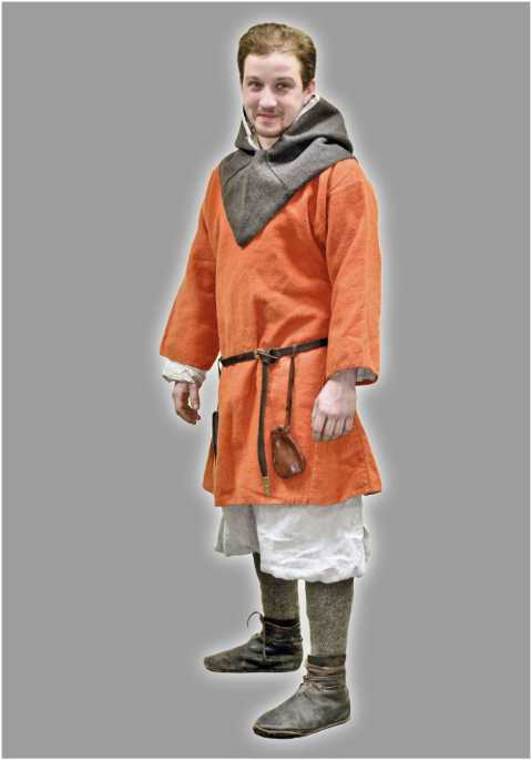 Скандинавский общинник-бонд. Автор реконструкции Е. Алексеев. Основу костюма скандинавов составляли рубашка и штаны, которые снизу закреплялись обмотками – длинными полосами ткани, или высокими шерстяными чулками. В отличие от Степи и Руси, в Скандинавии не сложилось традиции украшать бляшками пояса (но зато богато украшалась конская упряжь). Пояс зачастую имел только пряжку и наконечник. На пояс подвешивались необходимые в быту вещи – ножи, кошельки, осельки, кресала и т. п.