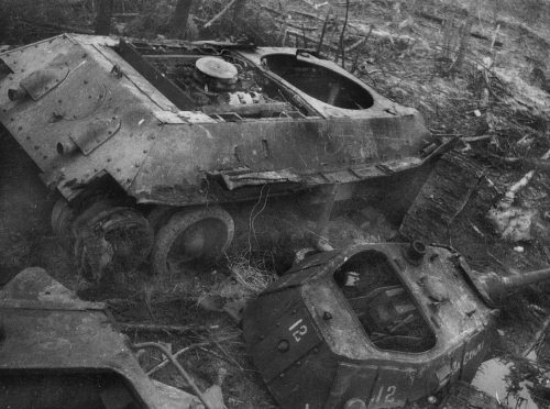 Наши надежды оправдались. Русским ничего не было известно о неудаче своего передового охранения, потому что пехота сидела на танках, пушки были в походном положении, а русские двигались маршем по дороге за линией фронта. Мы также могли различить грузовики между танками. Они, скорее всего, перевозили топливо и боеприпасы. Неприятель двигался мимо нас, прямо перед нашим взором, будто на параде. До него было не более километра. На каждом танке сидели и стояли от 10 до 15 солдат. Они и не подозревали, что мы поджидаем их тут.