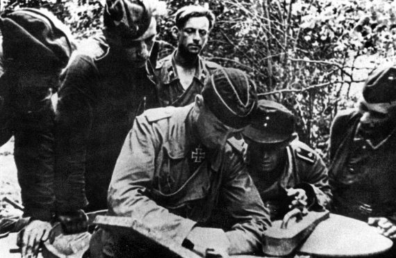 Кавалер Рыцарского креста лейтенант Отто Кариус ставит задачу экипажам своей роты. 502-й тяжелый танковый батальон, 1944 год.