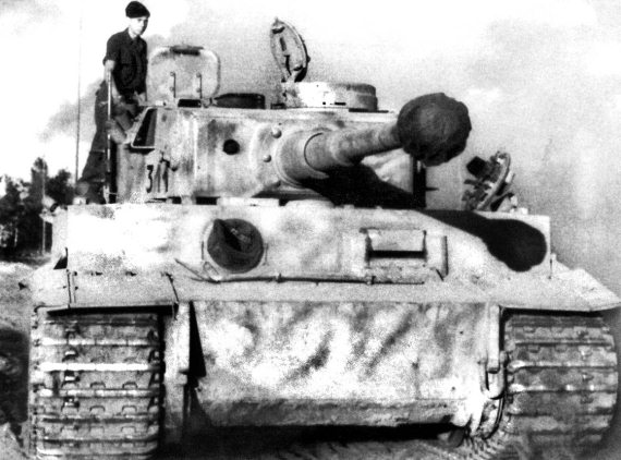 Один из «тигров» 502-го тяжелого танкового батальона. Лето 1943 года. Обращает на себя внимание эмблема – черный крест с белой окантовкой, вписанный в черный квадрат – характерная только для этого батальона.