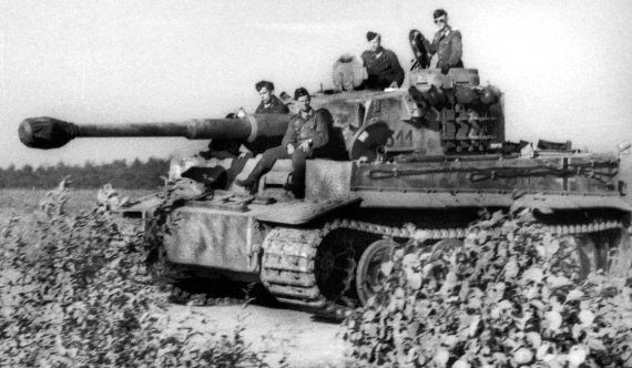 «Тигр» из состава 502-го тяжелого танкового батальона на марше. Район Невеля, осень 1943 года. Экипаж машины отдыхает, по-видимому, во время привала.
