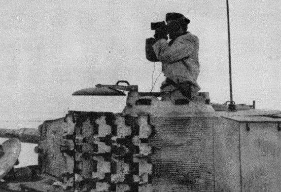 Командир танка „Тигр“ ведет наблюдение за местностью. Зима 1944 года.