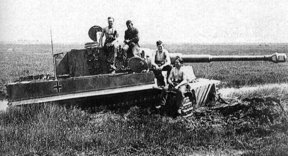 Застрявший в болоте «Тигр» из 502-го тяжелого танкового батальона. Прибалтика, лето 1944 года.