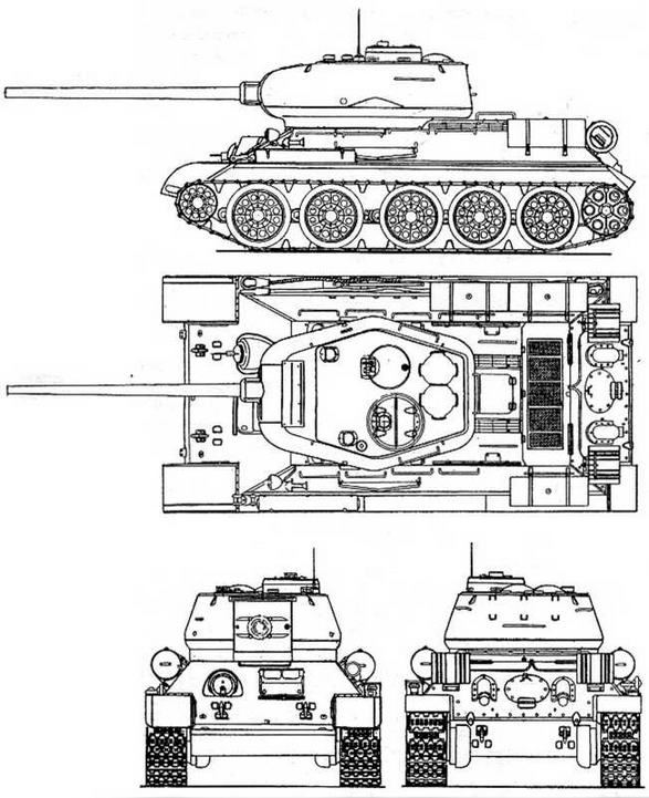 Т-34-85 (ЗИС-С-53) – 85-мм пушка ЗИС-С-53 с длиной ствола 54,6 клб. Командирская башенка сдвинута к корме башни. Изменен электропривод поворота башни. Радиостанция перенесена в башню. Изъят прицел ПТК, введен второй башенный вентилятор, внесены другие мелкие изменения.