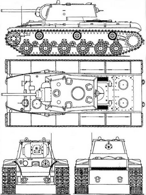 КВ-1 – первый серийный вариант. Корпус и башня – сварные, коробчатой формы. Боевая масса 47,5 т. Габариты 6750x3320x2710 мм, двигатель В-2К. Вооружение: 76-мм пушка Л-11 и 4 пулемета ДТ (1 запасной). Боекомплект 135 выстрелов, 2772 патрона. Бронирование 30... 75 мм, с осени 1941 года – 105 мм. Экипаж 5 чел. С ноября 1940 года устанавливается 76-мм пушка Ф-32, а с осени 1941 года – ЗИС-5. На части танков, выпущенных в первые месяцы войны, устанавливался двигатель М-17.