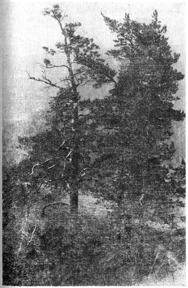 Путь на вершину Кедровой горы займет сорок минут – час. На ней – небольшая поляна, а за поляной – стена старого елового леса, будто из какой-то русской сказки. Волшебный зеленый урман встает перед путником. Недавно все это были нетронутые леса зеленой пригородной зоны. Теперь тут проложена лесовозная дорога, брошены стволы срубленного, но невывезенного леса, они уже гниют. От этих штабелей на юг уходит малозаметная тропа, маркированная краской по стволам елей. Эта тропа приведет нас к Мининским Столбам. Из-за густолесья, может быть, не сразу отыщутся сиенитовые скалы, однако найти их не очень сложно: походите по краю плоскогорья над долиной Малой Листвянки и вы обнаружите их.
