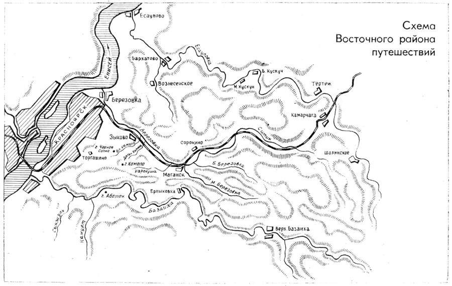 От поселка Ерлыковка на дороге Маганское – Береть до пионерского лагеря «Ласточка», который уже в черте Красноярска, вдоль реки нет населенных пунктов. Только несколько домов-кордонов заповедника Столбы стоят в пределах заповедной территории. От устья Большого Инжуля до Калтата по Базаихе проходит северная граница Столбов, и на всем течении этого участка Базаиха входит в охранную зону заповедника. Полоса – Базаиха от Ерлыковки до устья, а рядом прибазаихские леса, покрывающие Торгашинский хребет и горы около Маганска, – протянулась на пятьдесят-шестьдесят километров, достигая в ширину десяти-пятнадцати километров. Северная граница этой полосы – Красноярск, восточная – железная дорога. По осевой линии полосы вздымаются горы, и многие вершины имеют отметки более шестисот метров над уровнем моря, а самая высокая гора на этом участке – Черная сопка, или Каратаг, – достигает почти семисот метров. Под стать ей и ее южный сосед – гора Камала.
