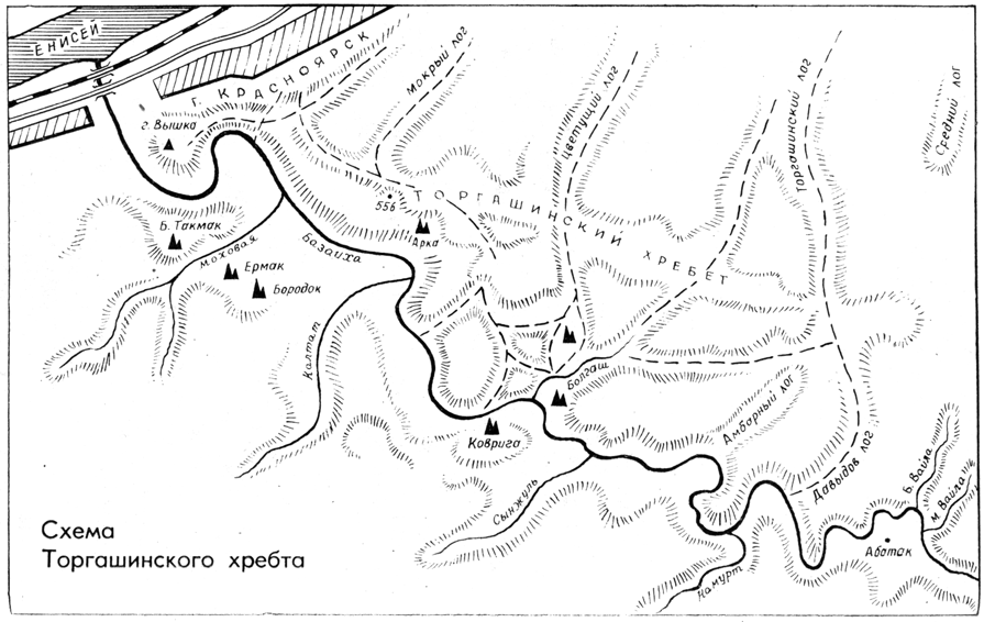 Итак, запомним ориентиры исходных точек наших походов по Торгашинскому хребту со стороны Красноярска: Городовой лог за заводом медпрепаратов, крутой Мурцев лог, выходящий основанием на Саянскую улицу в конце Кривоколенного переулка, известный всем Мокрый лог, в котором находятся одна из тренировочных санных трасс и лыжная база «Березка», Цветущий лог с Ивановым логом и Торгашинский лог.
