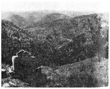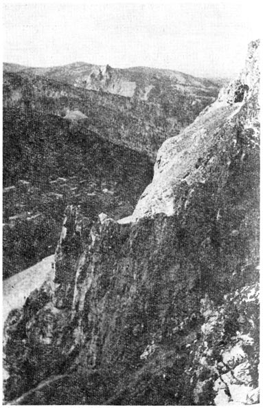 Если же мы пойдем по пещерной дороге дальше вниз, а потом вверх, то выйдем на высоты над рекой Базаихой, как раз в том месте, откуда так хорошо смотрятся меандры реки на участке около Сынжуля. Возвратиться отсюда лучше всего по дороге, что идет по вершине над Базаихой, на северо-запад. Дорога кончается у скал, поднимающихся над вершинами. Дальше тянется узенькая тропка, уже вниз по гребню хребтика.