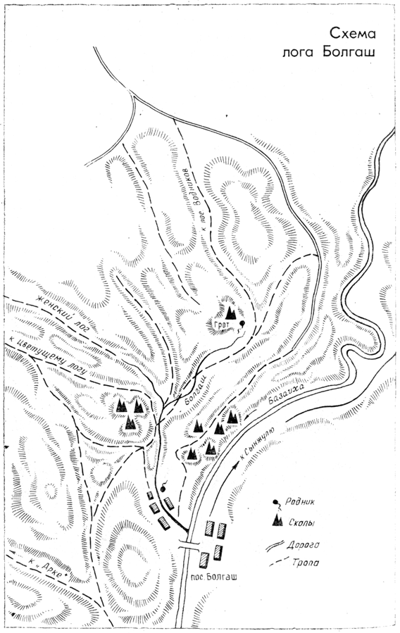 Вторая и третья тропы ведут к вершинам разных логов, ветвящихся от Болгашевского лога, о котором уже шла речь. Любая из них приведет нас вниз к устью ручья Болгаш на Базаихе. От устья Болгаша до конечной остановки тридцать девятого автобуса восемь-девять километров.