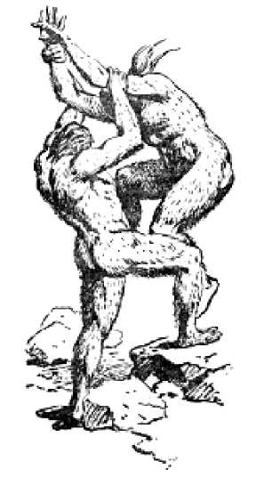Тогда Уа, выскочив за нами, окончательно рассвирепела – подняла обеими руками каменюгу, этак килограммов на триста, и с размаху бросила в Чо, словно мяч на баскетболе. Чо увернулся. Она схватила другой камень, чуть поменьше, и прицелилась. Но Чо успел подбежать к ней, стиснул ее вытянутые над головою руки, тряхнул – и камень выпал. Он не отпускал ее, ругаясь – что-то бормоча зло и угрожающе, но она повисла у него на руках и исступленно заколотила ногами ему по животу. Чо скрючился и оттолкнул ее подальше.