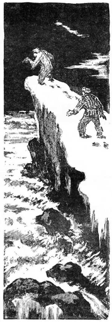 Но вековой инстинкт, видимо, был сильнее, чем разум в этом получеловеке-полуобезьяне. Галуб-яван пятился, тихо ворча и подвывая. И в тот момент, когда человек был всего в трех шагах, он в отчаянии поднял голову и первый раз осмелился взглянуть человеку в глаза, чтобы попытаться прочесть в них, что грозит ему. И он увидел в этих воспаленных от утомления глазах какую-то непонятную ему силу и решимость. Галуб-яван переступил ногами на самом краю льда и прыгнул в реку.