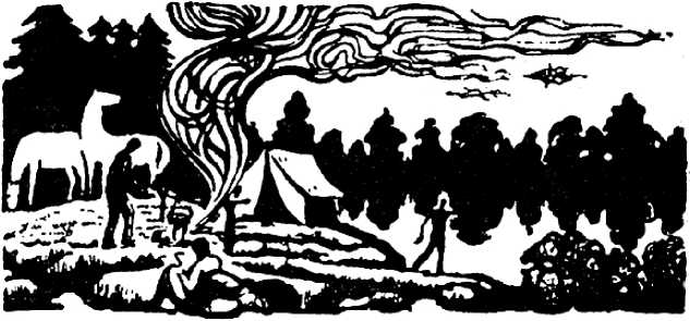 За этот длинный день, за большой переход, полный напряженной работы, мы все порядочно измотались, и так приятно было, засыпая, слушать шум реки, слабый шелест листьев, мерное похрустывание жующих лошадей.